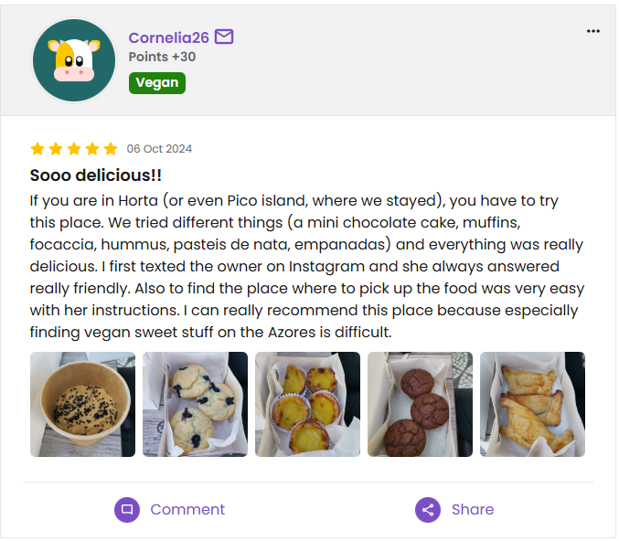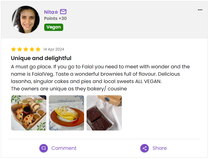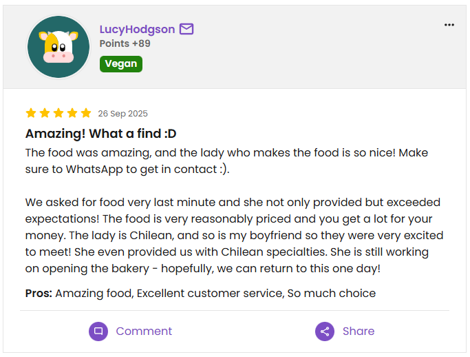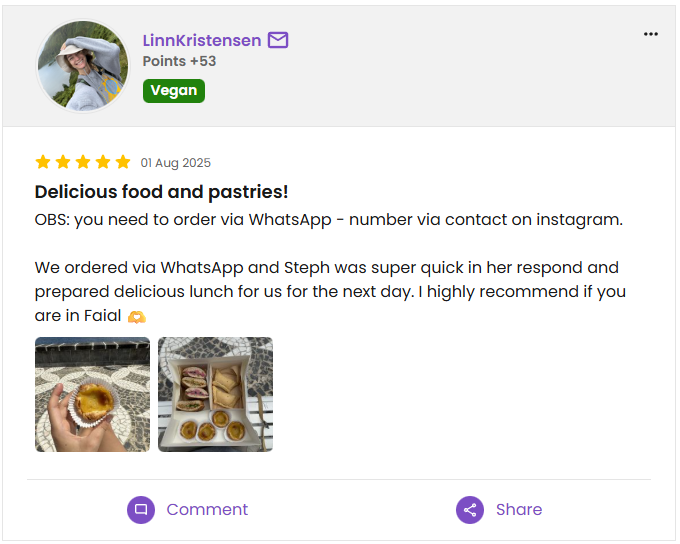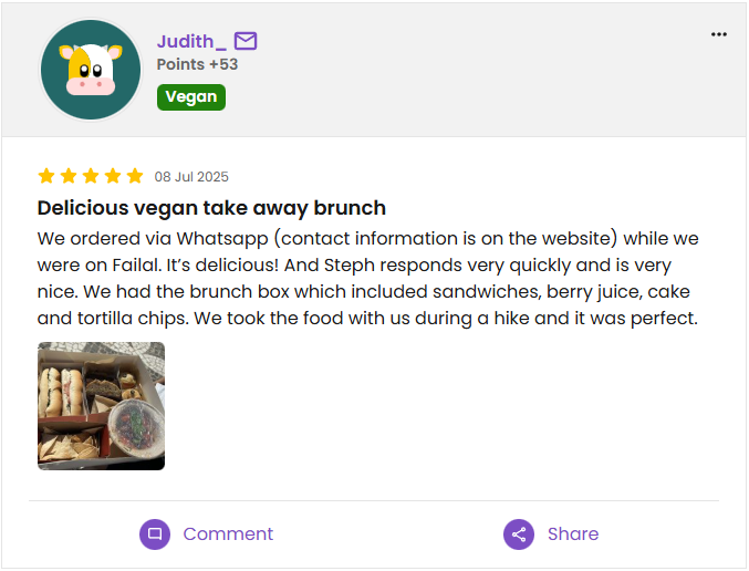 Customer reviews from platforms like Instagram, HappyCow and WhatsApp