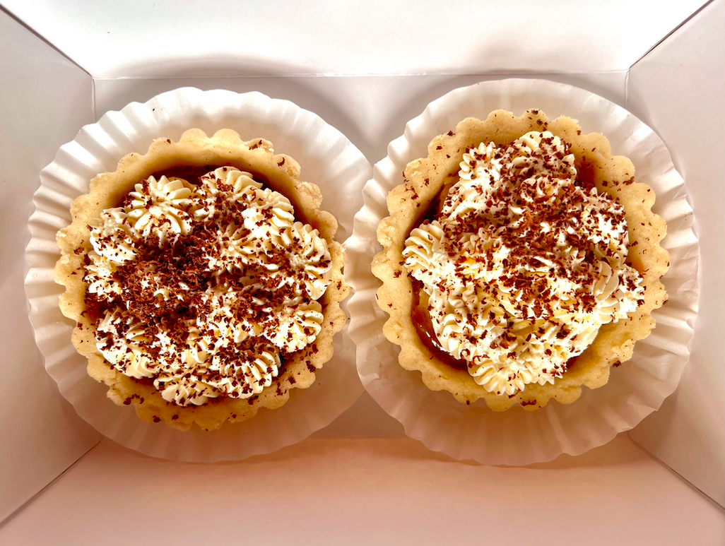 Banana and caramel pie, topped with homemade whipped cream and grated chocolate (22cm diameter).