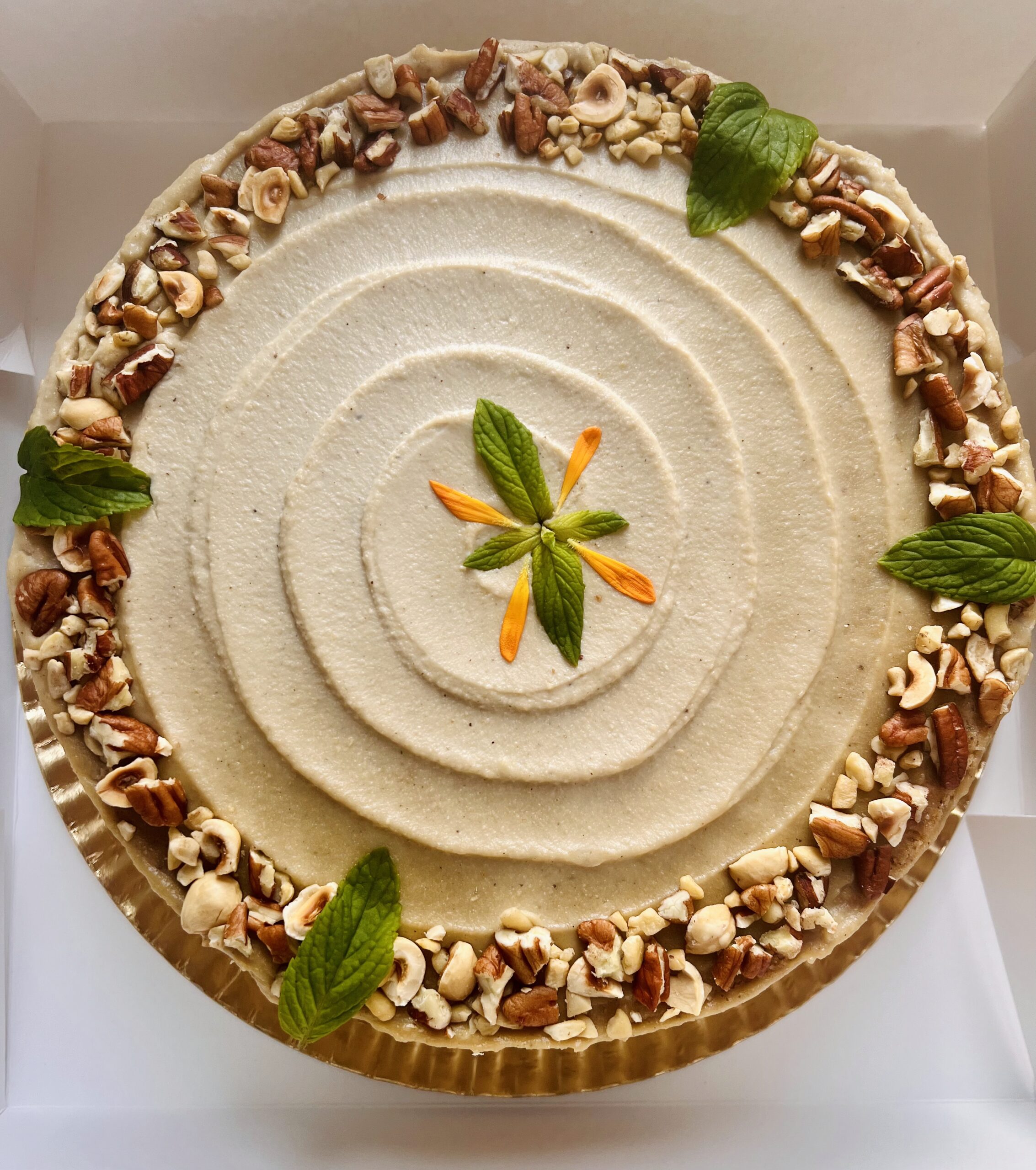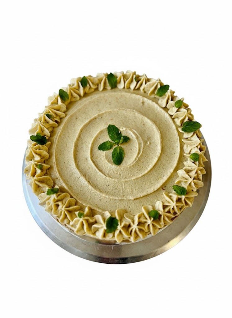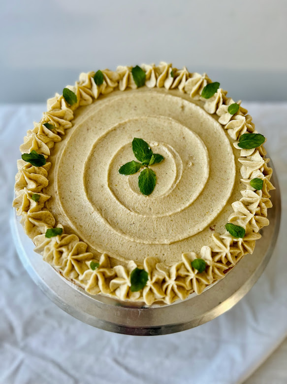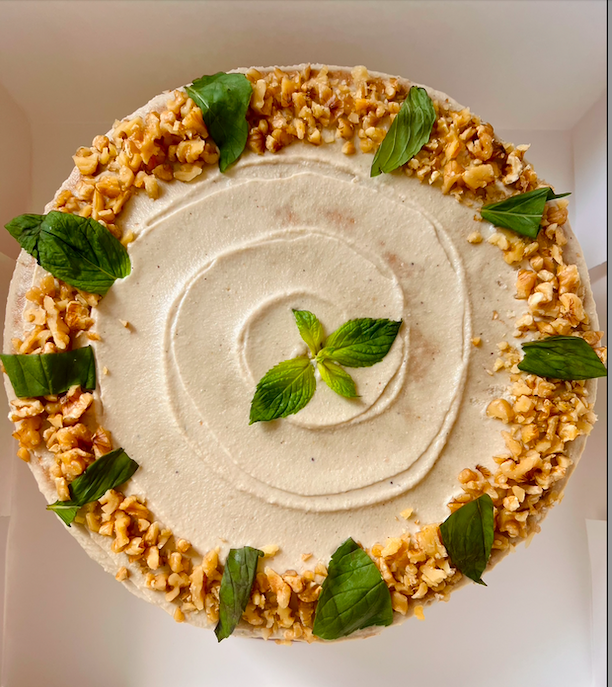 Traditional grate carrot cake with sweet spices, filled with cashew cream cheese frosting (24cm diameter).