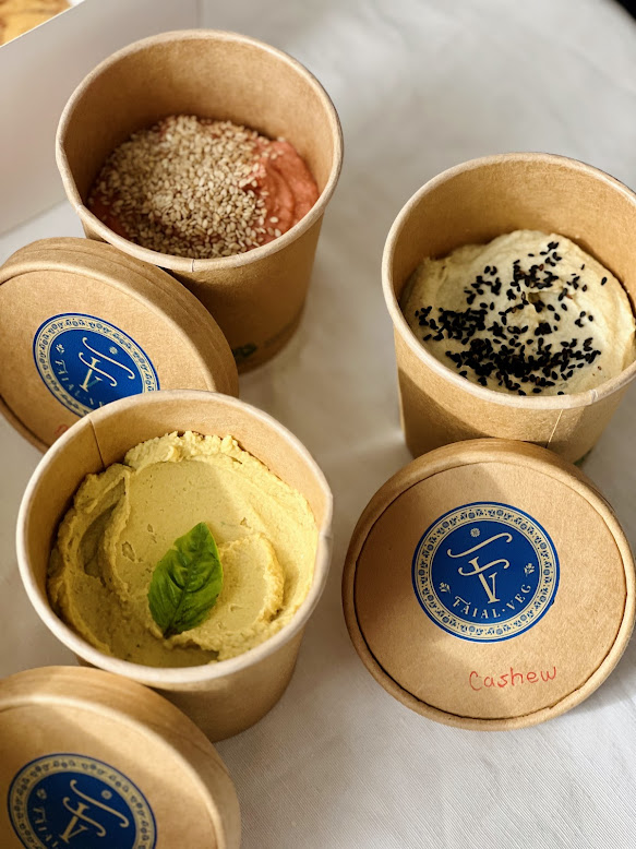 Homemade spreads. Options include cashew cream, sun-dried tomato pesto, spinach pesto, hummus, beet hummus, among others.
