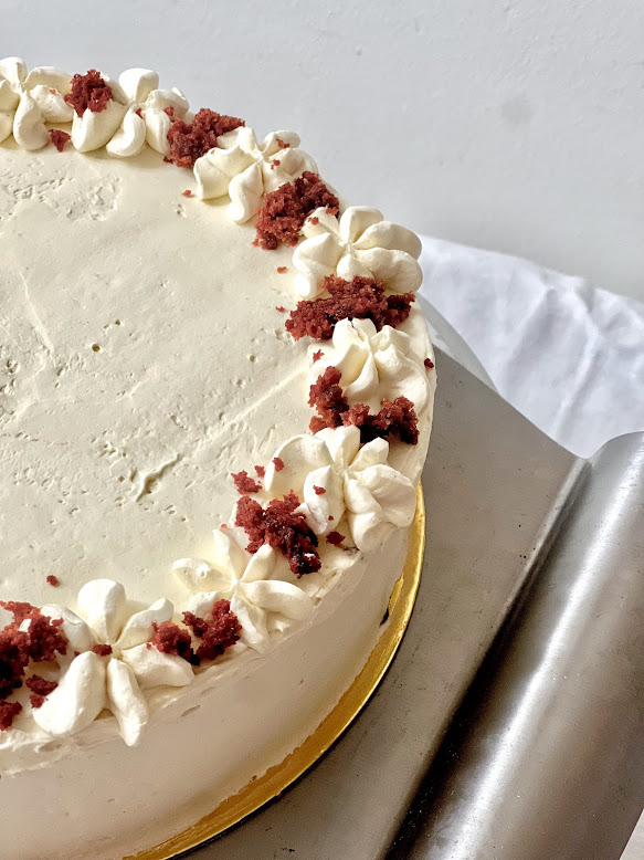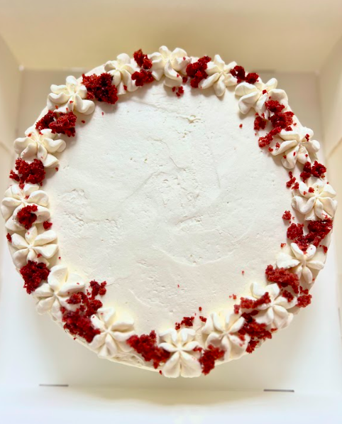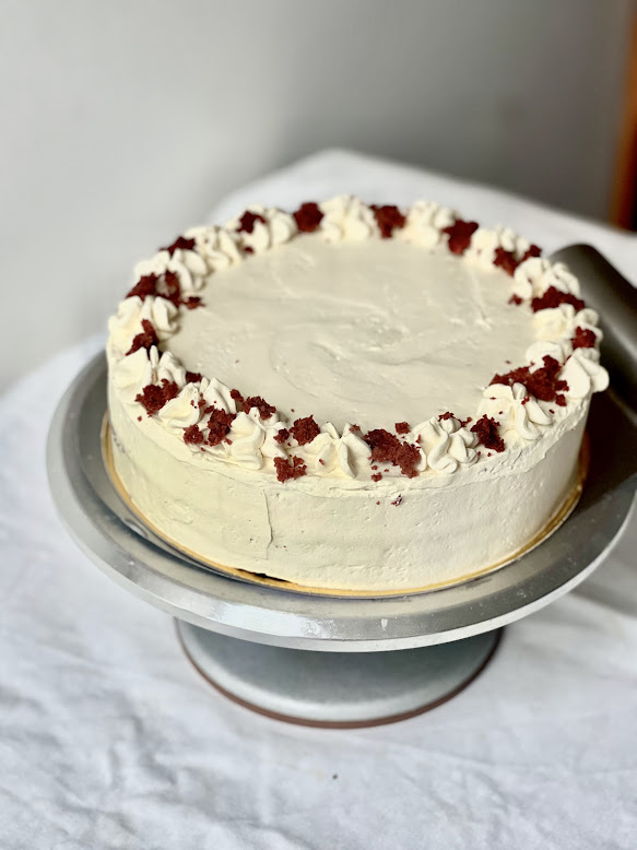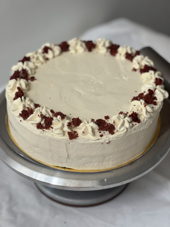 Red Velvet cake with vegan “cream-cheese” frosting (24cm diameter).